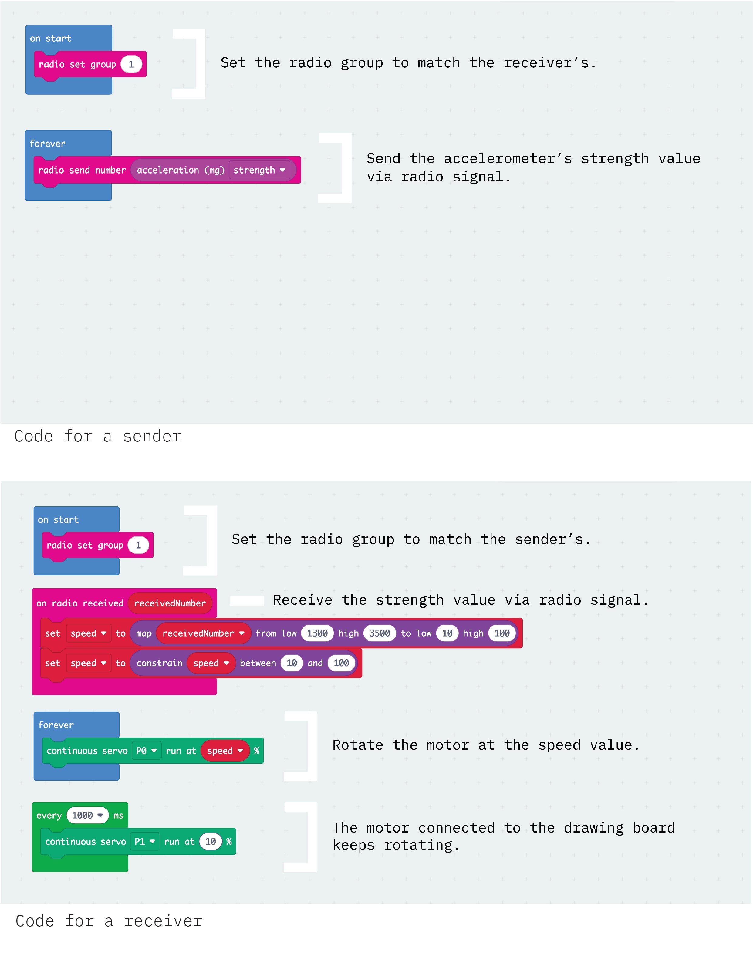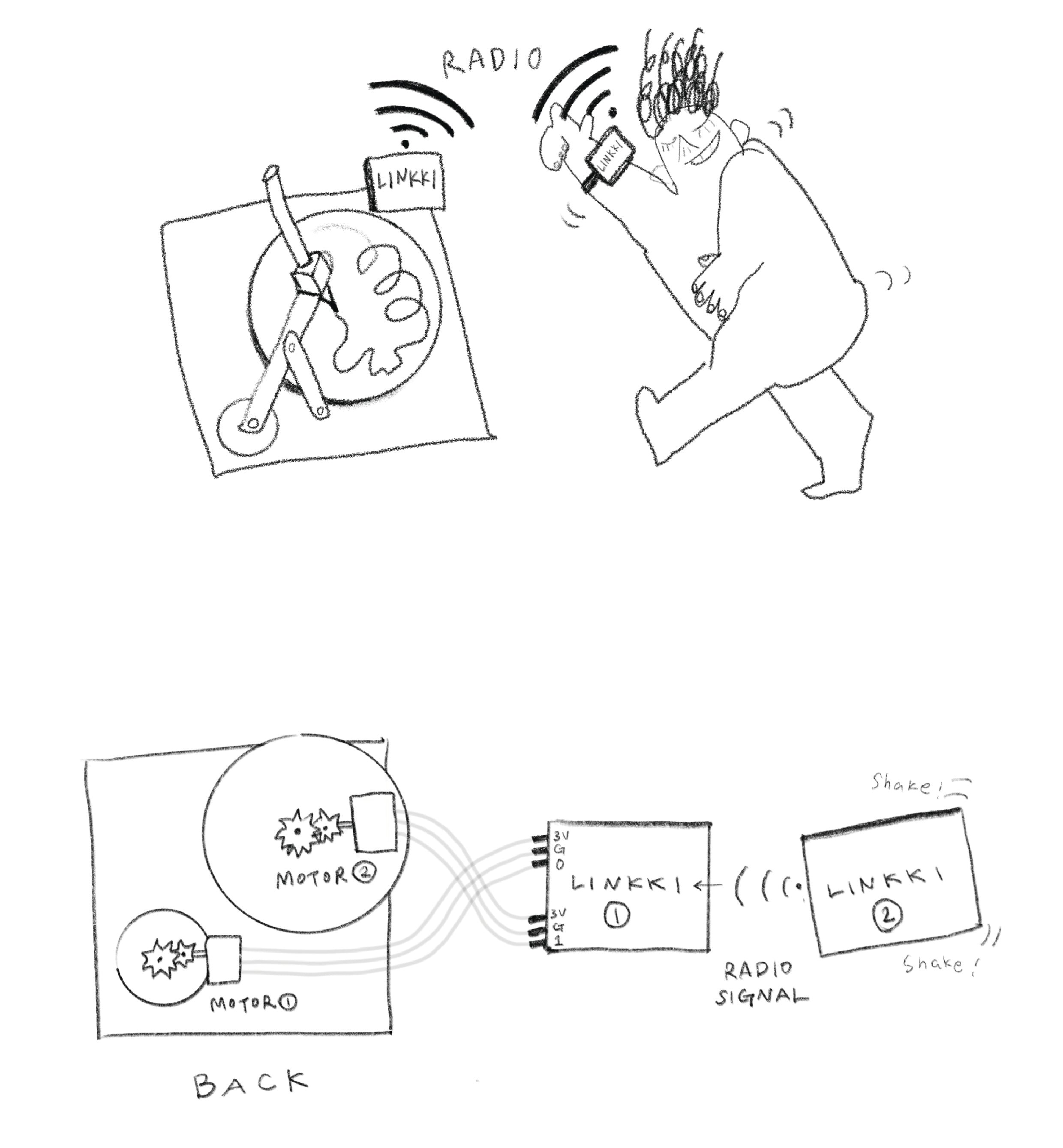 1. Connect two motors to pin0 and pin1 of Micro:bit (1). 2. Attach motor (1) connected to pin0 to the yellow circle on LINKKI. 3. Attach motor (2) connected to pin1 to the drawing board. 4. Hold Micro:bit (2) in your hand or attach it to your wrist using a band.