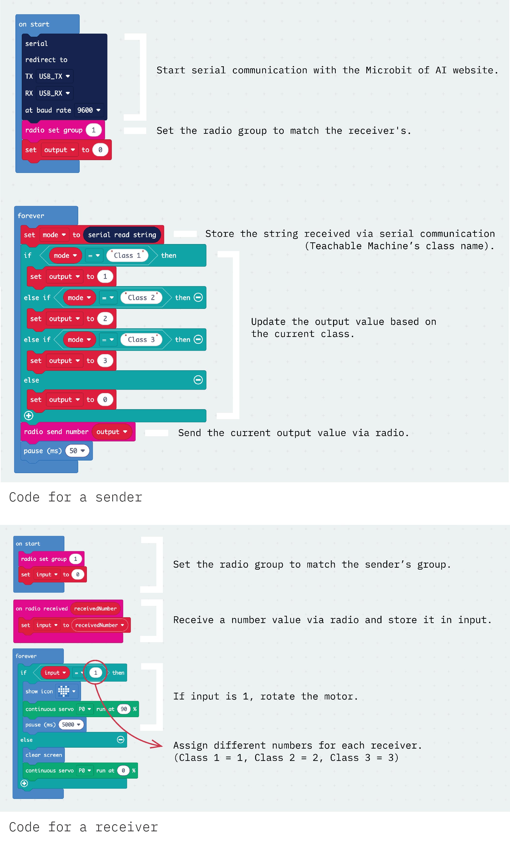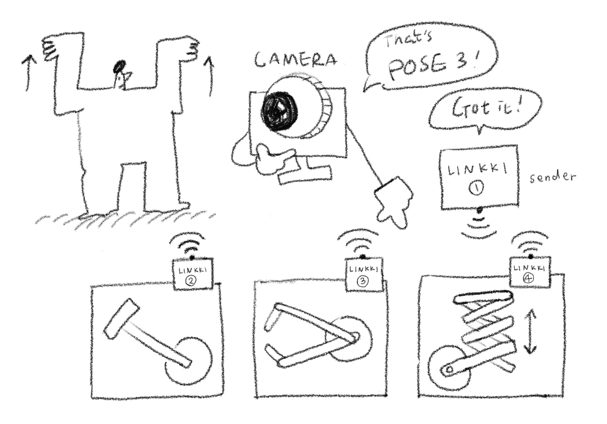 Step 1. Connect the Micro:bit to LINKKI. - Connect Micro:bit(1) to the computer. - Attach Micro:bit(2), (3), and (4) to their respective motors. Step 2. Create a pose model in Teachable Machine. - Set up the webcam to capture your full body. - Capture and upload pose samples in Google Teachable Machine. - Train the poses and copy the model link. Step 3. Link the Micro:bit to the pose model. - In the micro:bit of AI website, connect the Micro:bit and paste the model link. - When you perform the trained pose in front of the camera, Micro:bit(1) receives the signal and relays it to Micro(2), (3), and (4). Precautions - Use the micro:bit of AI website in Chrome or Edge browsers. - Every time you download new code to the Micro:bit, reconnect it to the web.