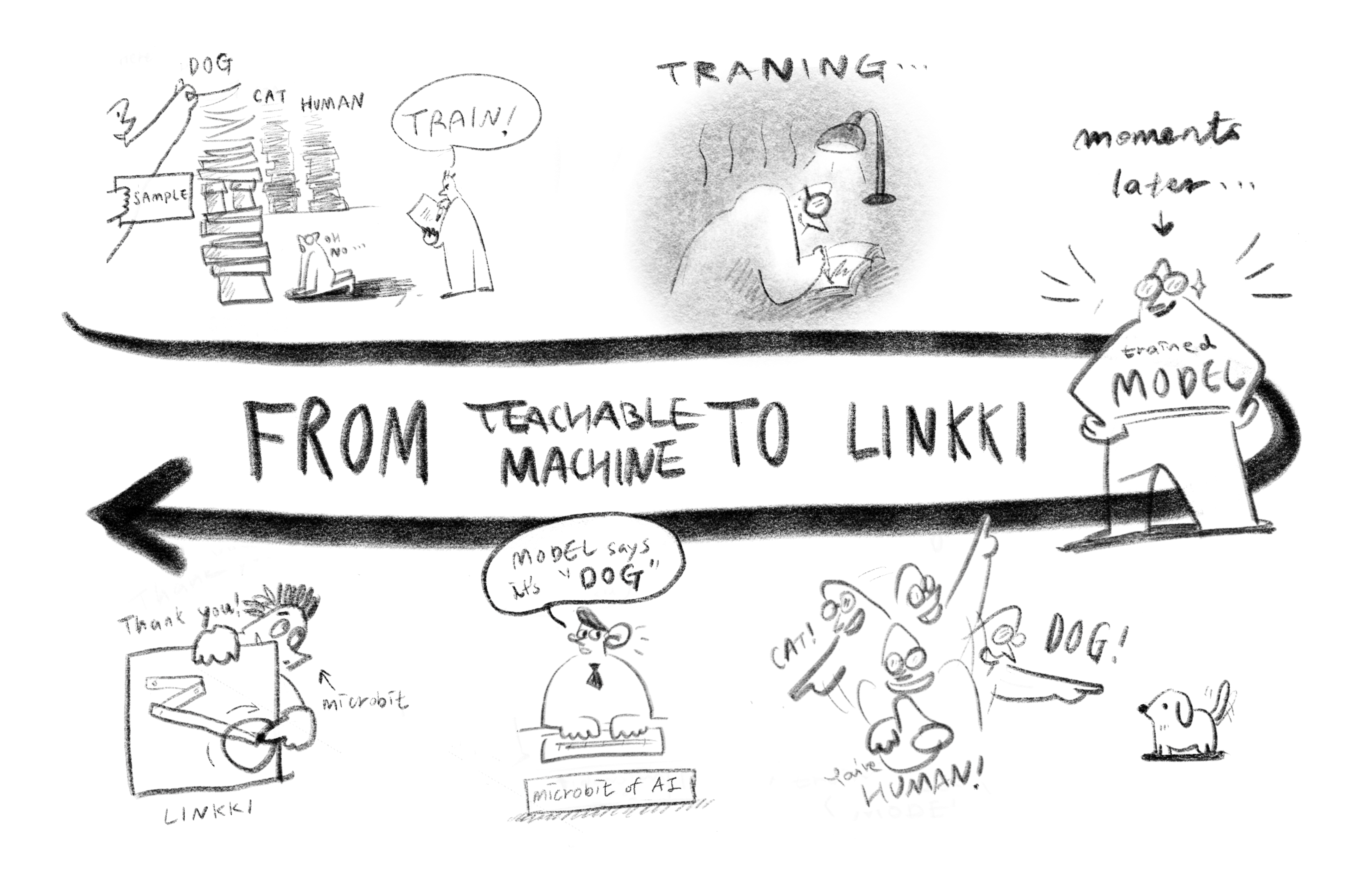 What is Google Teachable Machine? Google’s Teachable Machine is a program that helps computers learn to recognize different types of information like images, sounds, or movements. By showing the computer various data samples, it can learn to identify and categorize similar items later. For example, if you show it multiple pictures of cats and dogs, it can eventually tell the difference between a cat and a dog on its own. How does Teachable Machine work? First, you collect data samples—like photos or videos of different poses—and input them into the computer. The computer then goes through a “training” phase, learning to distinguish between each pose or image. Once training is complete, the computer can recognize new images or movements and decide which category they belong to. This process results in what’s called a “model.” How do I use a trained model with Micro:bit+LINKKI Motor Kit? The completed model isn’t directly uploaded to Micro:bit. Instead, the micro:bit of AI website imports the Teachable Machine model. The website uses a camera to detect new poses and classifies them (e.g., Pose 1 or Pose 2). The classified results are then sent to the Micro:bit, which responds by performing specific actions (e.g., rotating a motor). LINK Micro:bit of AI Google Teachable Machine